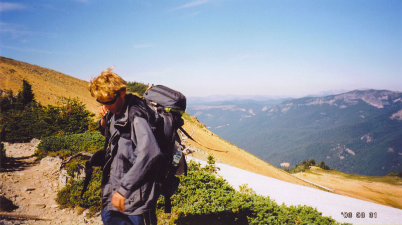 We all packed up, and moved on down the trail.  Gabe mistakenly puts on a jacket for the cool breeze.