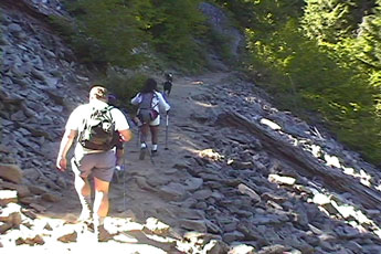 Soon the trail leaves the woods and is cut into this rocky hillside.