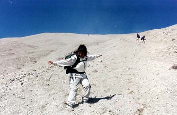 The descent begins with Sandra surfing the ashen slopes