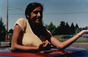 Sandra's sister, Anna, sticking out of the moonroof on our Honda, during her first trip to America in 1996.